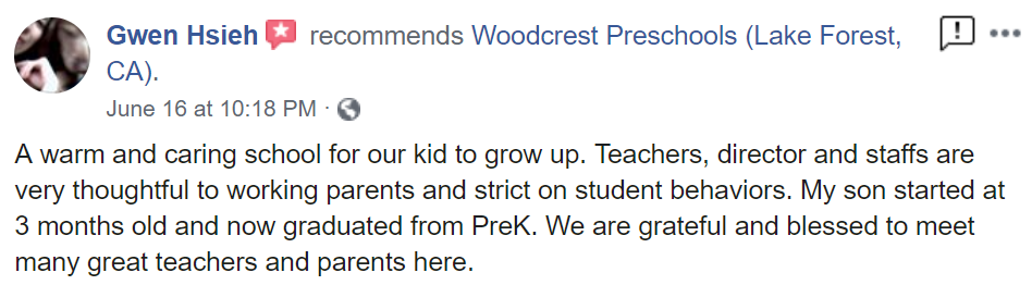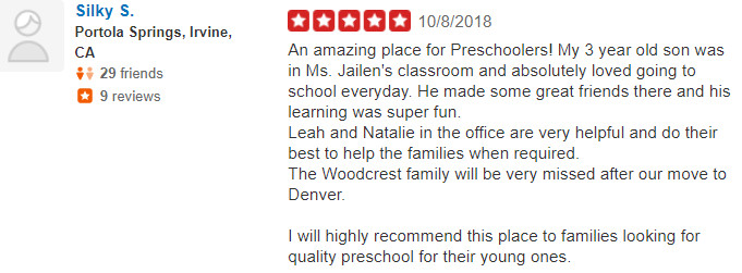 Thank you for your interest in Woodcrest Preschool in Lake Forest located at 21772 Lake Forest Dr. Our Lake Forest center is set on a park like campus filled with smiling students, dedicated teachers and supportive parents. The school is conveniently located in Lake Forest off the 5 FWY . If you are looking for a loving and nurturing preschool program with strong academics, fun themes, lots of play, and 21 century skill building, Woodcrest Preschool is the right place for your family.
